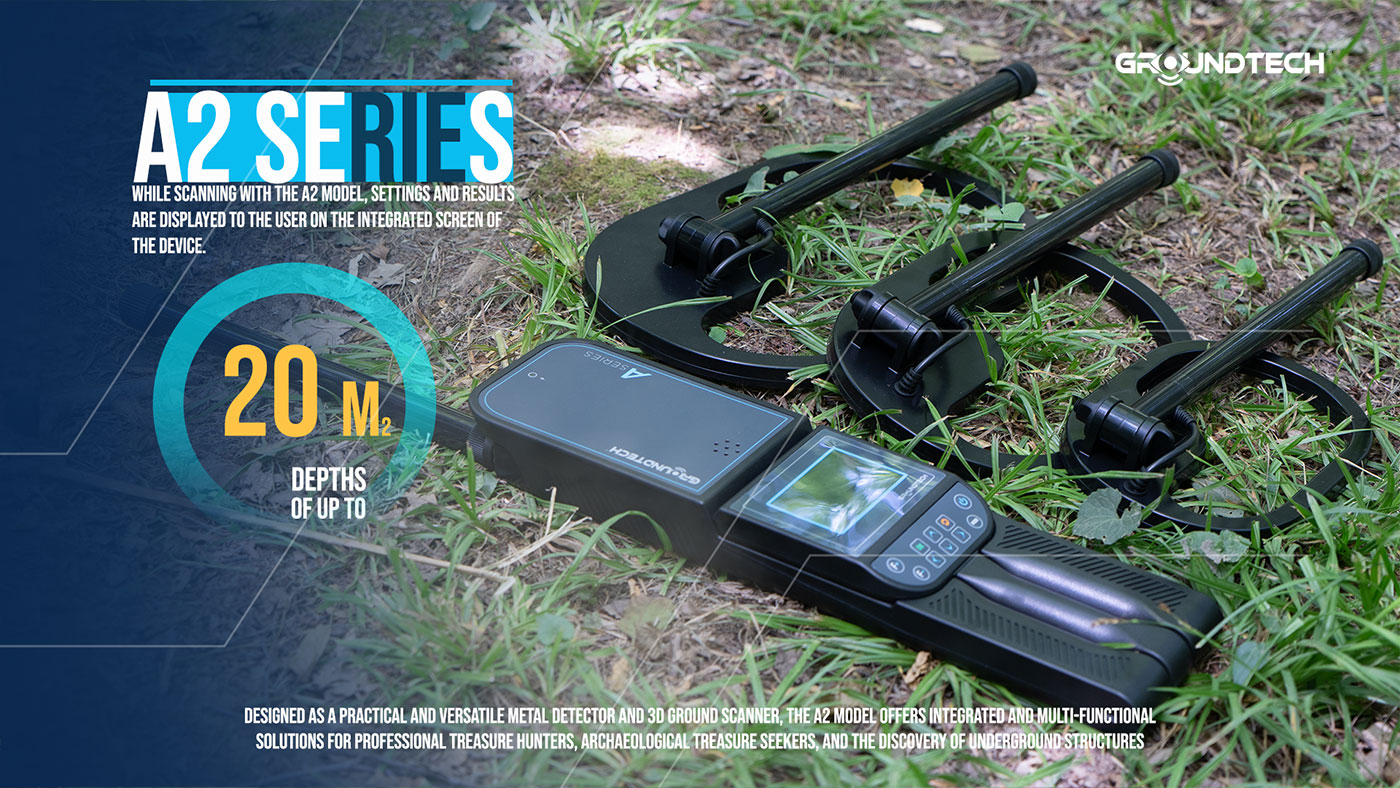 The A2 Model is an advanced ground scanning detector that allows you to detect underground anomalies and perform 3D analysis. Designed as a practical and versatile metal detector and 3D ground scanner, the A2 Model offers integrated and multi-functional solutions for professional treasure hunters, archaeological treasure seekers, and the discovery of underground structures. The device is equipped with six different scanning modes.